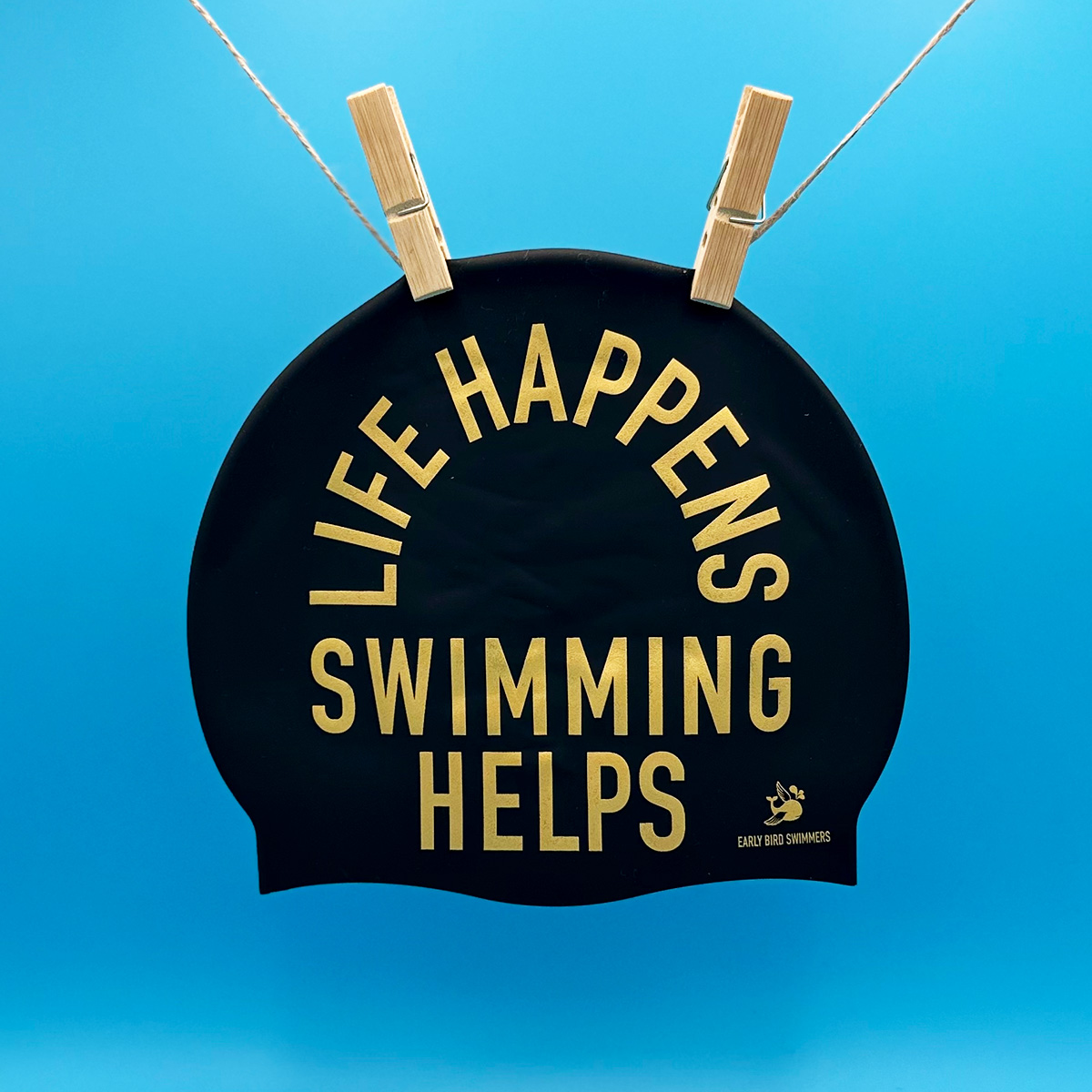 Limited Edition Life Happens Cap – geiler Gold Print auf schwarzer Suede Badekappe. Check out the super cool GOLD Print.